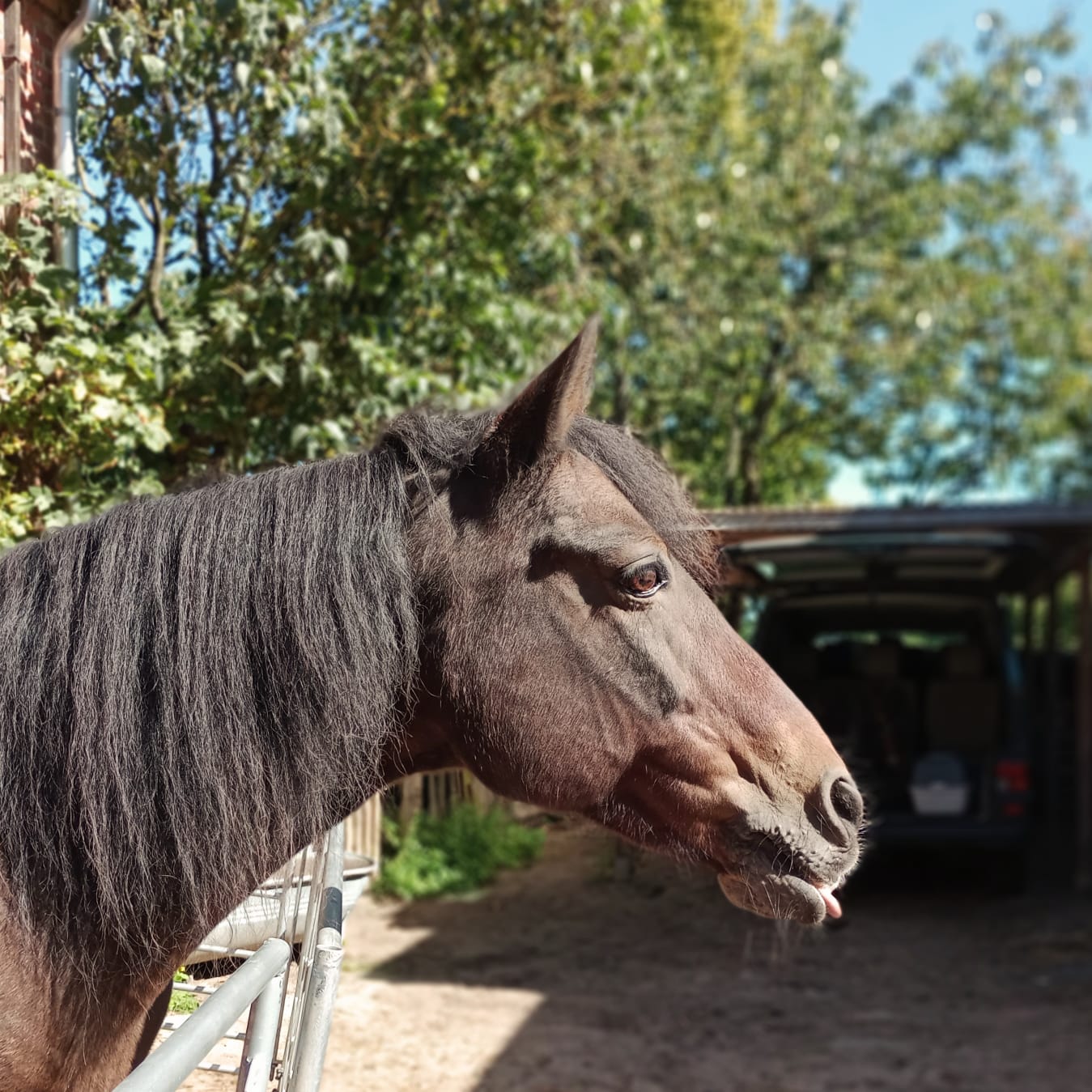 Nach mehreren physiotherapeutischen Behandlungen und einigen Wochen Training mit klarer Kommunikation ist sie heute ein zuverlässiges Pony für Kinder und zierliche Erwachsene und hat uns auch schon auf drei Wanderritte begleitet. Sie wird weiterhin regelmäßig physiotherapeutisch behandelt aufgrund ihres Unfalls und der Überbelastung in jungen Jahren. Wegen ihrer Vorgeschichte möchten wir sie so vielfältig wie möglich beschäftigen, denn sie hat es verdient, ganzheitlich gefördert, gepflegt und lieb gehabt zu werden. Sie ist sehr bewegungsfreudig, neugierig, liebt Spaziergänge, Ausritte und hat Freude an der Bodenarbeit. Für sie suchen wir eine engagierte Reit-und Pflegebeteiligung, idealerweise ein reiterlich fortgeschrittenes Kind oder eine zierliche Erwachsene.
