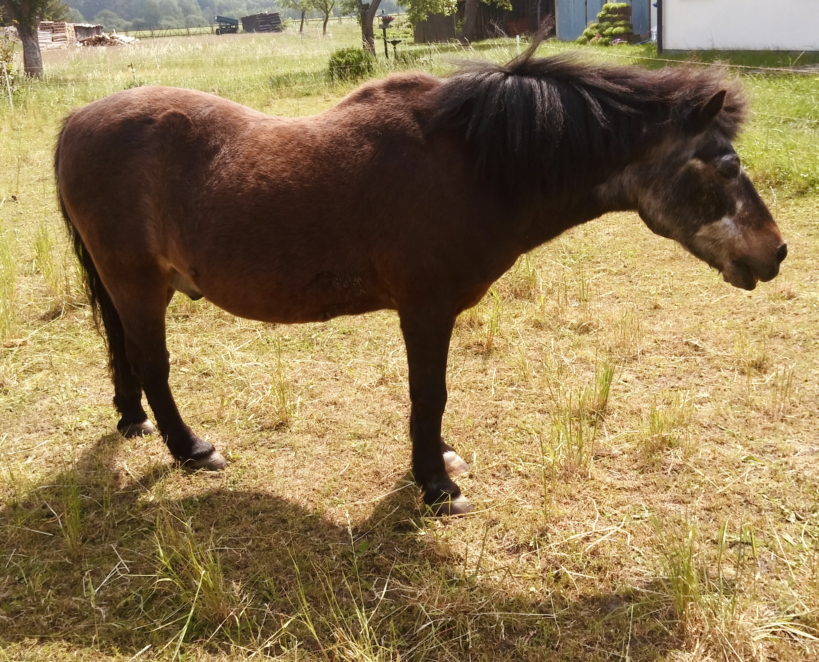 leider typisch für ein Shetty ihrer Größe, fürs „Ponyreiten“ auf den unterschiedlichsten Veranstaltungen „benutzt“ worden. Sie hat bei uns ein paar Jahre gebraucht, um Kindern wirklich zu vertrauen. Auch heute noch kann sie es aus guten Gründen nicht ausstehen, wenn jemand sie wie einen Gegenstand behandelt, sie plötzlich und ohne Vorwarnung anpackt oder übergriffig ist.Ansonsten ist sie ein fröhliches und immer unternehmungslustiges Pony, das auf Ansprache sehr fein reagiert und bei Langeweile allerlei schlaue Streiche ausheckt. Es ist schwer, ernst zu bleiben, wenn Mira ihren intelligenten Shettyhumor auspackt. Ich weiß nicht mehr, wie viele Verschlüsse ich schon ersinnen musste, um die Tür zwischen ihrem Winterpaddock und dem Heulager zu sichern. Es dauert nie lange, bis sie den Dreh raus hat. Und irgendwie ist es auch einfach sehr unterhaltsam ihr heimlich dabei zuzusehen, wie sie nach einigem Nachdenken Splinte herauszieht, Riegel verschiebt, Klinken drückt, Hebel verdreht, Stromzäune am Plastikgriff öffnet und demnächst vielleicht mit dem Schlüssel aufschließt. Für sie wünschen wir uns einen erwachsenen Paten, der regelmäßig mit ihr wandern und Fahrrad fahren geht, mit ihr Lachen kann und vielleicht auch Lust hat, sie mit Freiarbeit, Zirzensikübungen oder anderen geistig anregenden Aktivitäten weiter zu fördern. Als Shetty-Energie-Bündel in den besten Jahren liebt und braucht sie sehr viel Bewegung und mentalen Input, um sich so richtig pudelwohl zu fühlen.